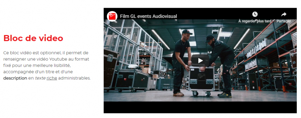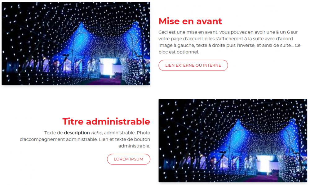 Vous pouvez renseigner jusqu'à 6 mises en avant qui s'afficheront de façon alternée image à gauche, texte à droite puis image à droite, texte à gauche et ainsi de suite.
