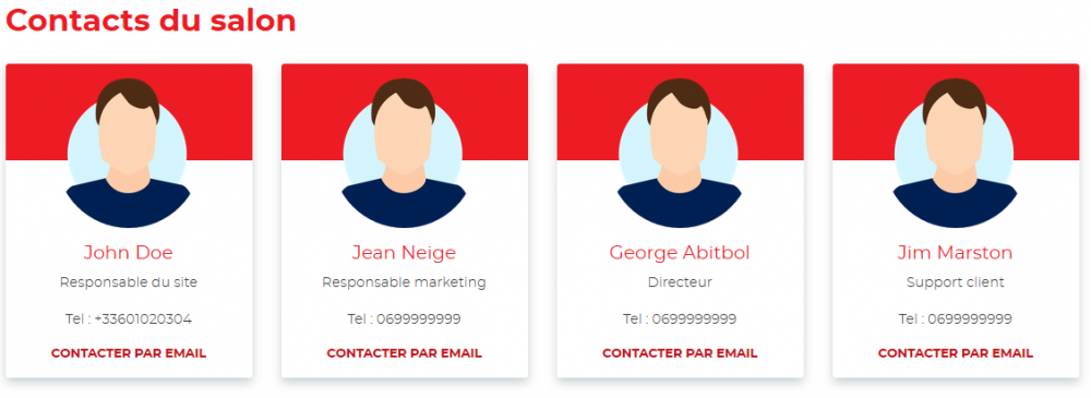 Le modèle a été conçu pour afficher des lignes de 4 contacts au format desktop qui s'afficheront dans l'ordre que vous aurez défini dans le back office.